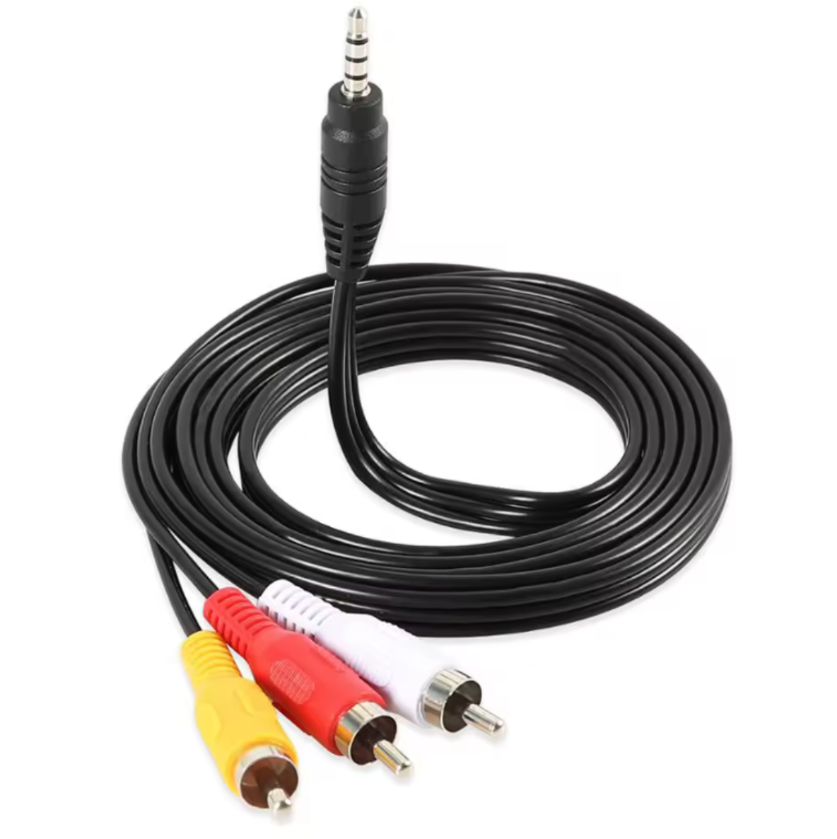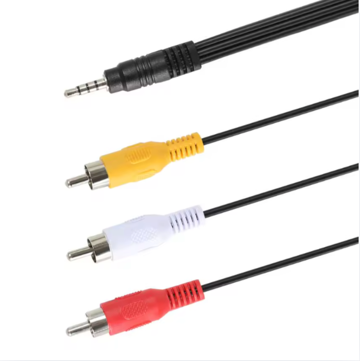 Este cable adaptador te permite extraer señal de audio y video desde un conector 3.5mm AV, ideal para conectar diversos dispositivos a equipos con entradas RCA.