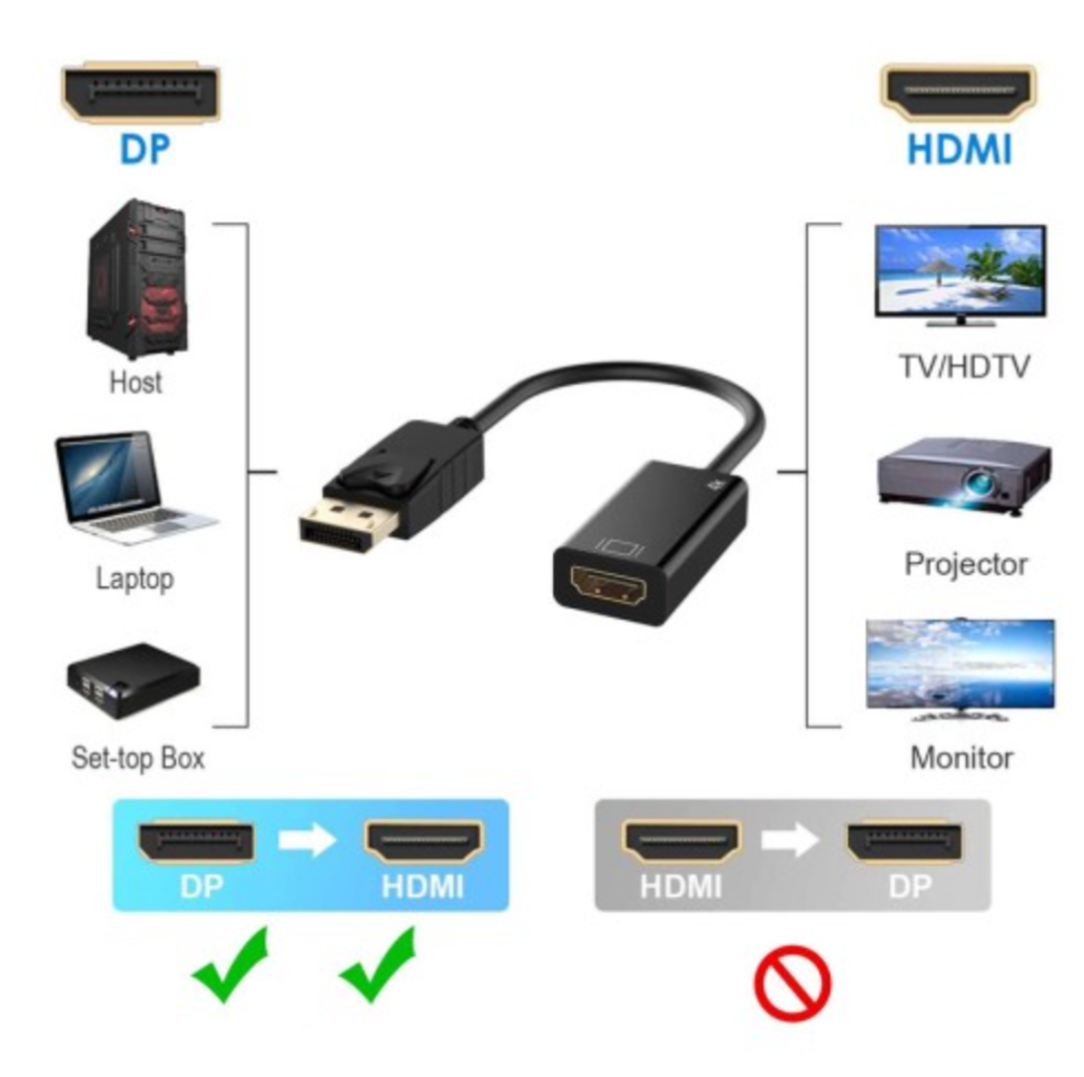 ❗ Nota: Conversión de DisplayPort a HDMI únicamente (no funciona en sentido contrario).