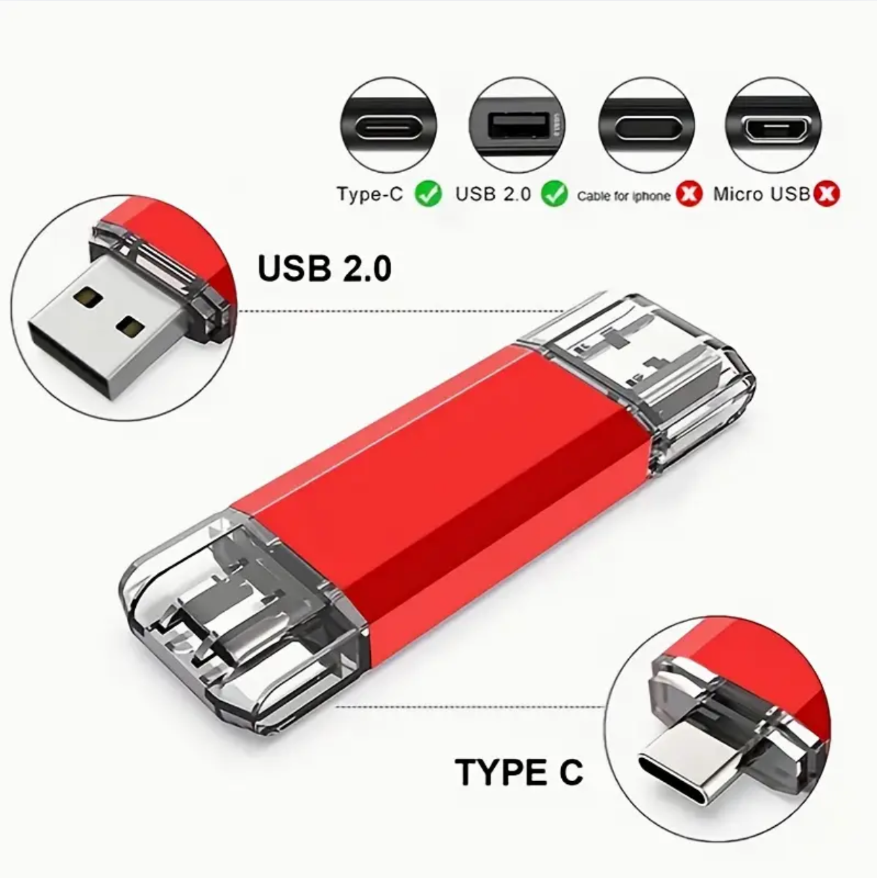 ¡Lleva tus archivos contigo a donde vayas! Esta unidad flash 2 en 1 USB + Tipo C combina funcionalidad y compatibilidad en un diseño compacto y elegante 100GB, es ideal para transferir fotos, videos, música y documentos entre dispositivos Android, tablets y computadoras.